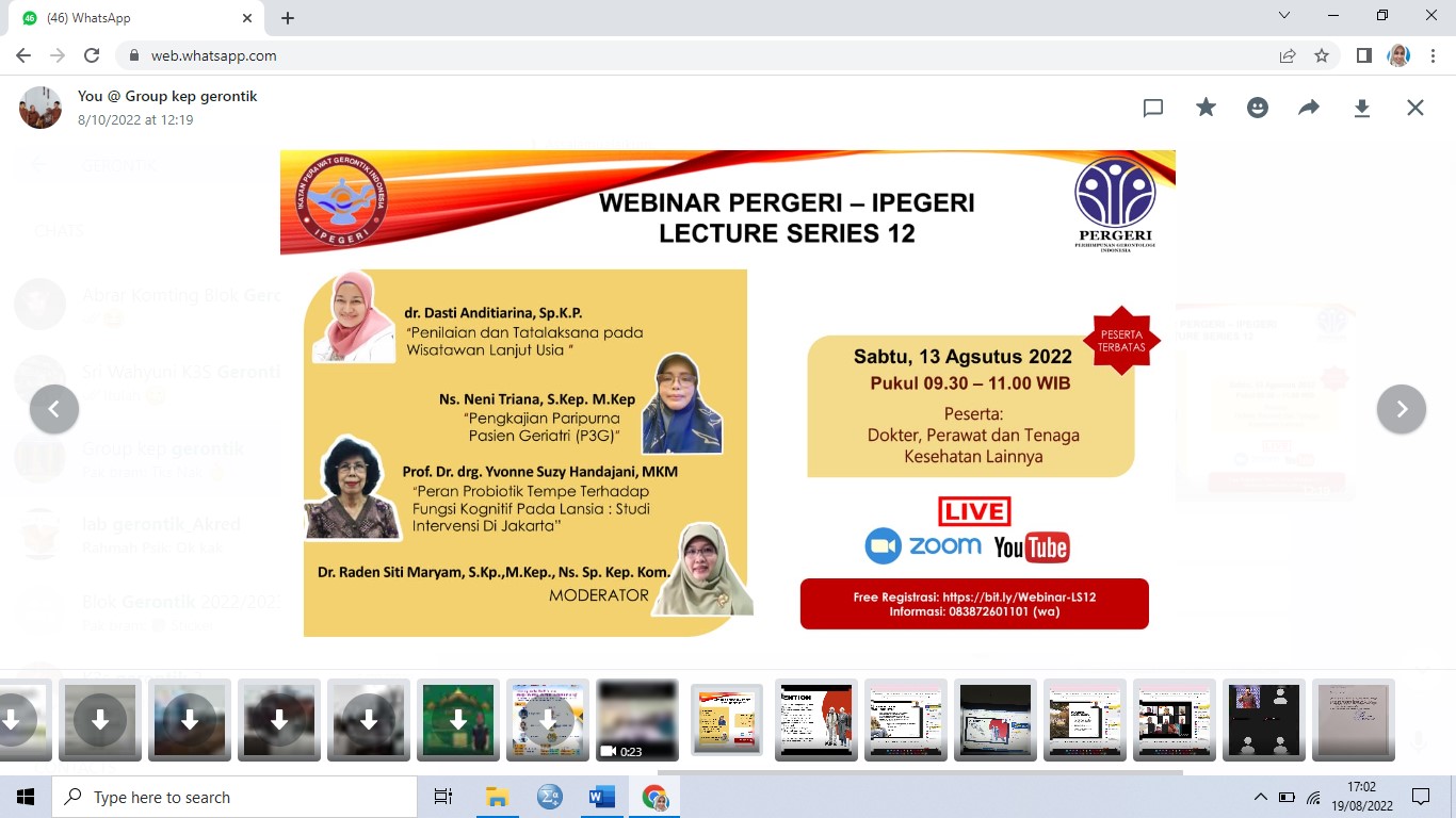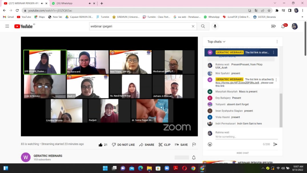 Perhimpunan gerontologi Indonesia (PERGERI) dan Ikatan Perawat Geriatri Indonesia (IPEGERI) melaksanakan kegiatan webinar lecture series 12 pada hari Sabtu tanggal 13 Agustus 2022. Pemateri pada webinar ini melputi dr. Dasti Anditiarina, Sp.K.P dengan topik “Penilaian Dan Tatalaksana Pada Wisatawan Lanjut Usia”, dilanjutkan oleh Ns. Neni Triana, S.Kep. M.Kep dengan topik “Pengkajian Paripurna Pasien Geriatric (P3G)”, dan diakhiri pemateri Prof. Dr. drg. Yvonne Suzy Handajani, MKM dengan topik “Peran Probiotik Tempe Terhadap Fungsi Kognitif Pada Lansia: Studi Intervensi Di Jakarta”. Acara ini diikuti oleh para dosen keperawatan bagian keilmuan keperawatan gerontik Fakultas Keperawatan USK.