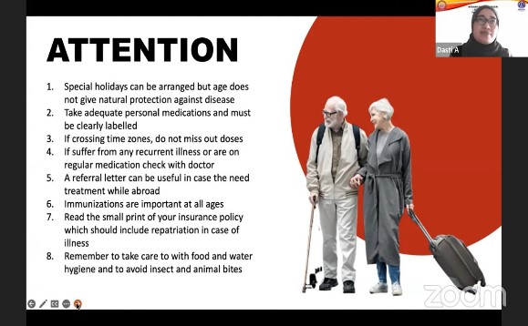 Webinar ini menghadirkan materi dari berbagai profesi baik perawat, dokter maupun dokter gigi. Pemateri menjelaskan masalah kesehatan pada lansia dan hal yang paling menarik terkait pengkajian pada lansia harus dilakukan dengan secara paripurna serta pengawasan terhadap wisatawan lansia harus dengan penilaian dan tatalaksana yang sesuai dengan standar.