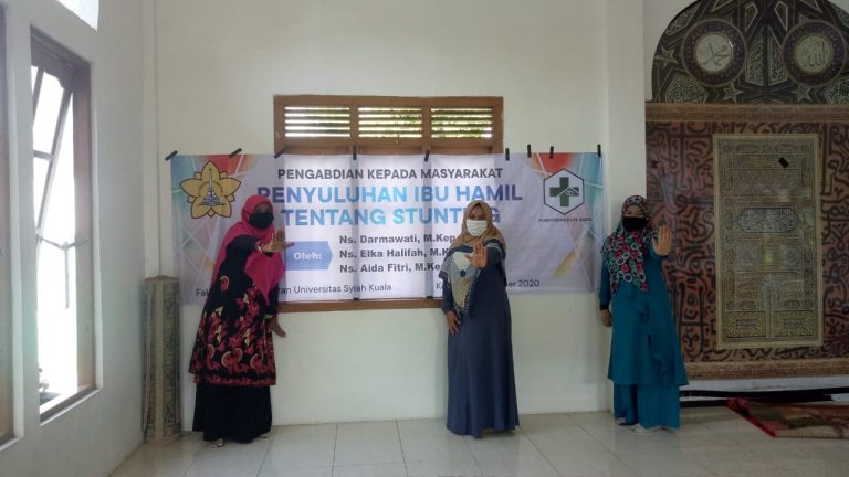 Aceh Besar (27/01/2021) Dosen bagian Keilmuan Keperawatan Maternitas Fakultas Keperawatan Universitas Syiah Kuala yang melaksanakan pengabdian kepada masyarakat dengan memberikan penyuluhan kesehatan pada Ibu hamil tentang stunting di Desa Cot Peutanoe Kecamatan Kuta Baro Aceh Besar. Kegiatan yang di pimpin oleh Ns. Aida Fitri, M.Kep sebagai ketua pengabdi, bersama Ns. Darmawati, M.Kep., Sp. Mat, danNs. Elka Halifah, M.Kes.
