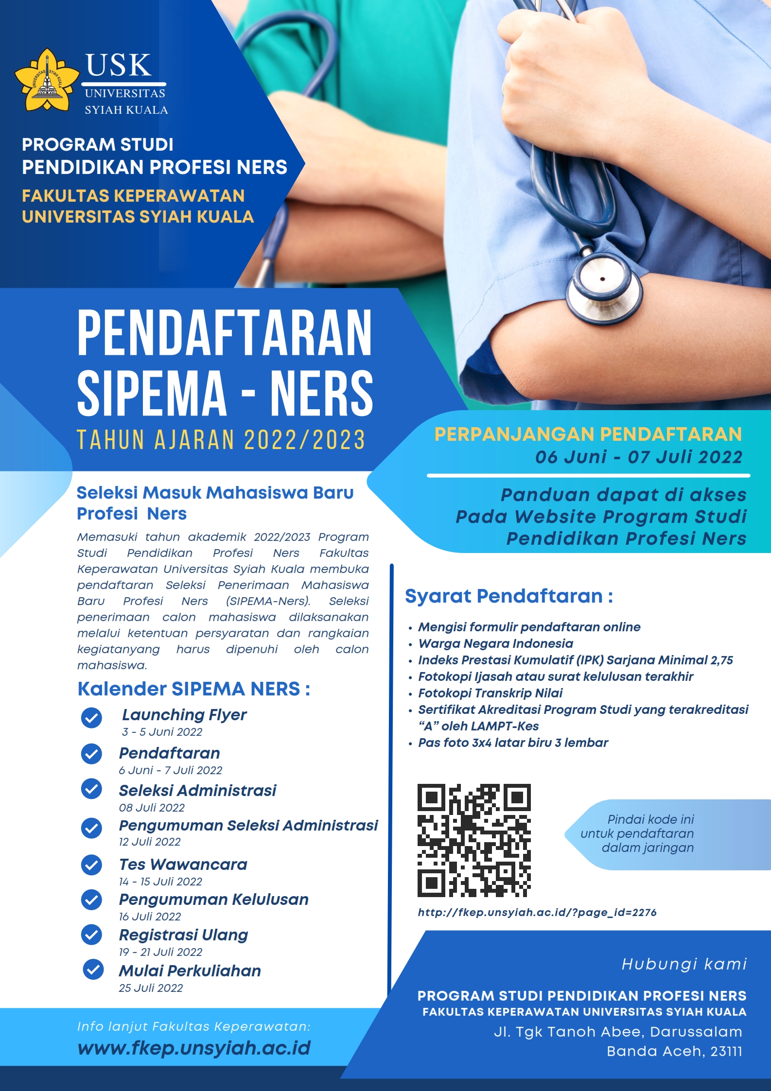 Memasuki tahun akademik 2022/2023 Program Studi Pendidikan Profesi Ners Fakultas Keperawatan Universitas Syiah Kuala membuka pendaftaran Seleksi Penerimaan Mahasiswa Baru Profesi Ners (SIPEMA-Ners) secara online bagi lulusan Sarjana Keperawatan tertentu yang memenuhi persyaratan yang ditentukan, untuk menempuh Pendidikan Profesi Ners.