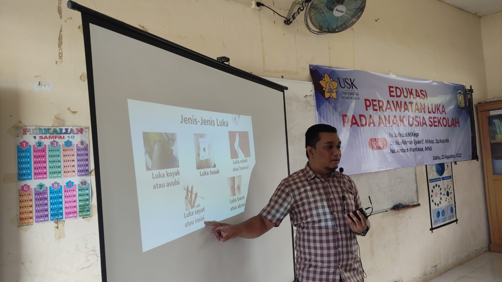 Dosen Fakultas Keperawatan yang diketuai oleh Ns. Jufrizal, S.Kep., M.Kep dan tim pengabdian Dr. Ns. Hilman Syarif, M.Kep., Sp.Kep. MB dan Ns. Andara Maurissa, MNS melakukan pengabdian kepada masyarakat di Sekolah Binaan Fakultas Keperawatan pada tanggal 20 Agustus 2022 tentang Edukasi Perawatan Luka Pada Anak Usia Sekolah. Kegiatan ini turut dihadiri oleh Drs. Tarmizi selaku kepala sekolah SD Negeri Cot Preh, serta BEM Fakultas Keperawatan sebagai fasilitator sekolah binaan. Tujuan dari kegiatan Pengabdian kepada masyarakat ini adalah untuk memberikan edukasi tentang perawatan luka sederhana pada siswa/i yang nantinya bisa diaplikasikan jika ada yang mengalami luka baik dilingkungan sekolah maupun diluar lingkungan sekolah.